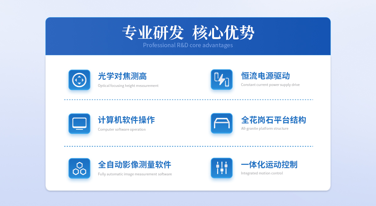 1.采用美國TEO高清晰彩色CCD攝像頭(或HKVISION網(wǎng)口相機)及手動卡位變焦物鏡作為測量瞄準(zhǔn)系統(tǒng); | 2.由移動工作臺、三軸電子光柵尺和運動專用控制盒組成數(shù)據(jù)傳動控制系統(tǒng); | 3.采用雙重閉循環(huán)運動控制,保證電機在高速運動時**的定位性能; | 4.采用本公司開發(fā)的嵌入式模塊控制機電,提高了電機響應(yīng)速度,同時簡化儀器與PC的接口,; | 5.采用全花崗石平臺結(jié)構(gòu),外觀簡潔大方,永不變形,永不生铚; | 6.表面光由四環(huán)八區(qū)環(huán)形LED光源組成,每一組均為恒流電源驅(qū)動,并按需要分區(qū)程序顯示; | 7.Z軸影像對焦直接通過電腦軟件作,無需手動調(diào)焦,大幅度提高工作效率; | 8.具有多種數(shù)據(jù)處理、顯示、輸入、輸出功能,使測量與辦公完全結(jié)合在一起; | 9.與電腦連接后,采用DTVCNC全自動影像測量儀專用軟件測繪圖形進行處理及輸出; |