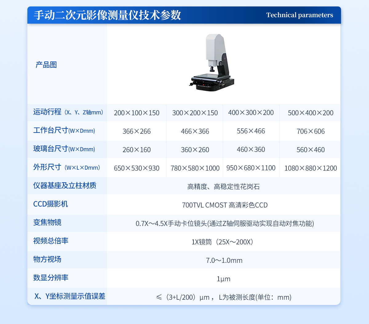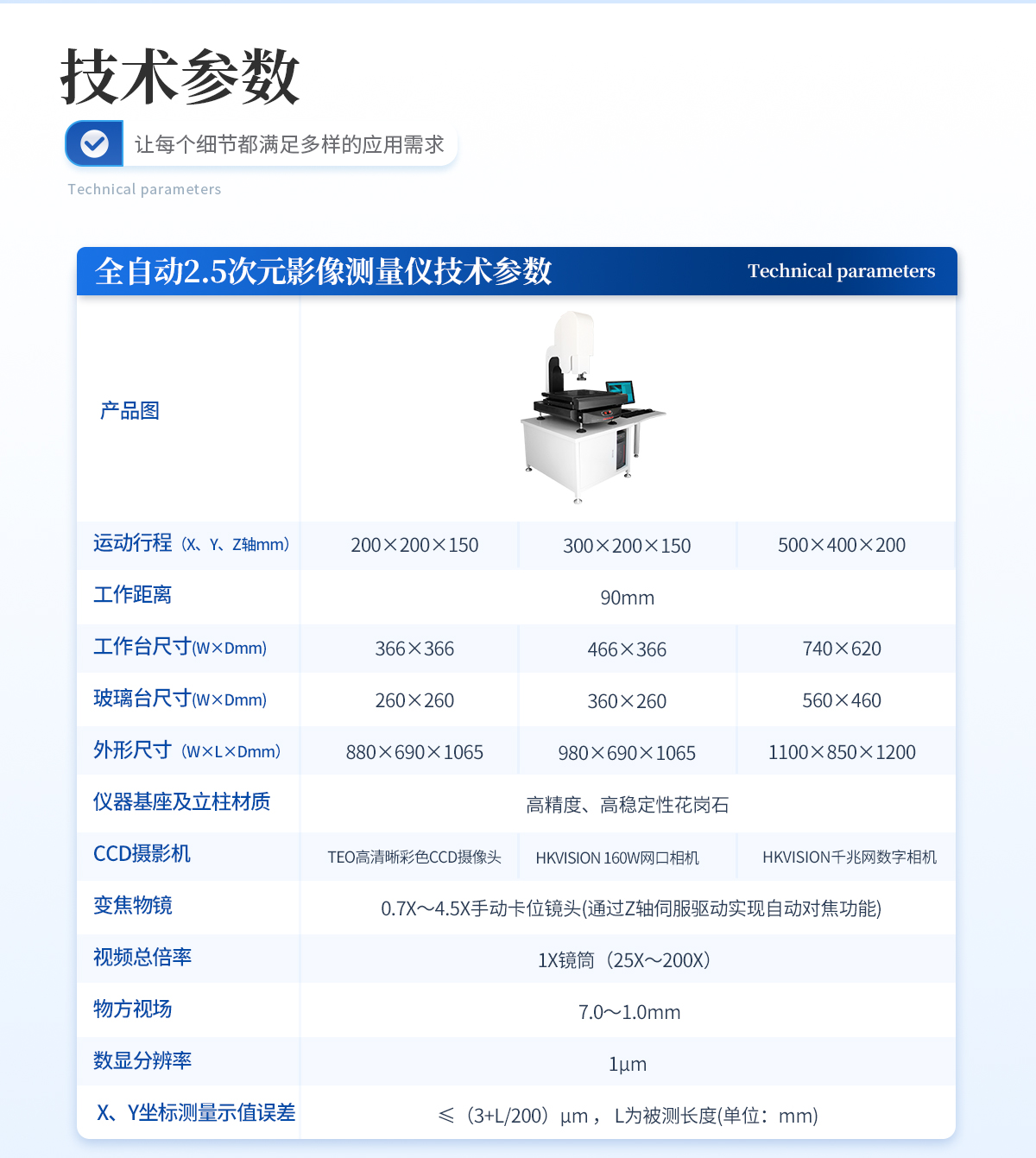 1.運動行程(X、Y、Z軸mm):200×200×150 | 2.工作距離:90mm | 3.工作臺呎寸(W×Dmm):366×366 | 4.玻璃臺呎寸(W×Dmm):260×260 | 5.外形尺寸(W×L×Dmm):880×690×1065 | 6.儀器基座及立柱材質(zhì):高精度、高穩(wěn)定性花崗石 | 7.CCD攝影機:美國TEO高清晰彩色CCD攝像頭(或HKVISION網(wǎng)口相機) | 8.變焦物鏡: 0.7X~4.5X手動卡位鏡頭(通過Z軸伺服驅(qū)動實現(xiàn)自動對焦功能) | 9.視頻總倍率: 1X鏡筒(25X~200X) | 10.物方視場: 7.0~1.0mm | 11.數(shù)顯分辨率:1μm | 12.X、Y坐標(biāo)測量示值誤差≤(3+L/200)μm , L為被測長度(單位:mm) | 13.作方式:XYZ三軸全自動伺服電機控制 +集成一體化運動控制設(shè)計 (只需對接220V電源接口、USB接口、AV視頻接口即可使用) | 14.測量軟件:INS全自動影像儀專用測量軟件 | 15.工作環(huán)境:溫度20±5 °C,濕度35%-75%(盡量滿足環(huán)境條件),如果溫濕度條件不能達到以上標(biāo)準(zhǔn),至少要將儀器放置在少灰塵,少油氣,遠離振動源的室內(nèi)。 |